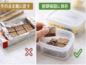 3つ目はにおい移りです。冷蔵庫にそのまま入れると、ほかの食品の香りが移ることがあります。とくに開封済みは、箱のままよりも密閉容器に移したほうが保存しやすいです。