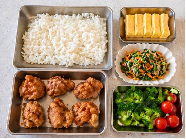 具体例として、朝に卵焼き・唐揚げ・ご飯を詰める場合を考えてみましょう。卵焼きは切って断面を見せるように並べる、唐揚げは皿に離して置く、ご飯はしゃもじで軽くほぐして広げる。