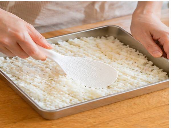 炊きたてのご飯をそのまま詰めず、いったん広げます。しゃもじで軽くほぐすと、湯気が抜けやすくなります。丸く山にせず、平らに近い形がコツです。