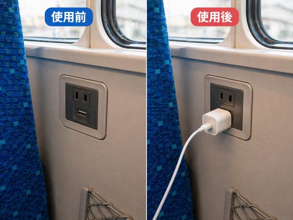 コンセント付きの席を取っても、充電器本体を忘れると使えません。スマホのケーブルだけ持っていて、USBポートだと思っていたらコンセントタイプだった、ということもあります。新幹線のコンセントは、基本的に家庭用の電源プラグを差すタイプとして考えておくと準備しやすいです。